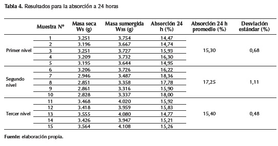 La técnica usada permite determinar la absorción de agua final al término de 24 horas, las muestras ubicadas en el nivel 2 del horno son las que presentan mayor tasa de absorción con un porcentaje del 17,25 %, entre el nivel 1 y el nivel 3 los valores son similares 15,30 % y 15,40 %, respectivamente.
