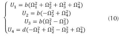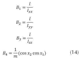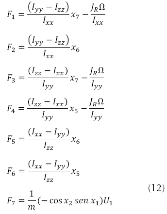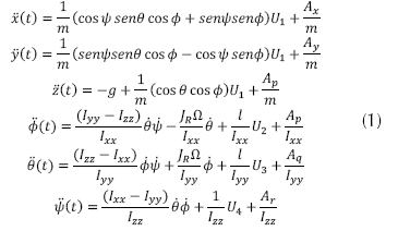 El modelo dinámico que se presenta en la ecuación (1) se tomó por Bouabdallah (2007), el cual Euler Lagrange fue escogido por la simplificación de dinámicas no modelas e incertidumbres paramétricas, quien nos arroja las siguientes ecuaciones de movimiento para el sistema del quadrotor.