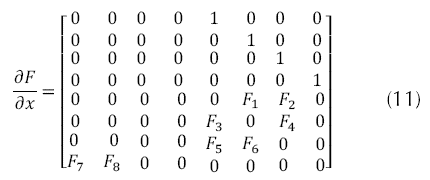 La matriz de estado se presenta en la ecuación (11), con los términos de la misma son descritos por la ecuación (12).
