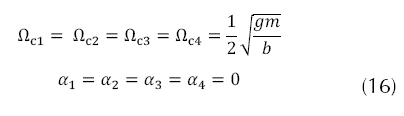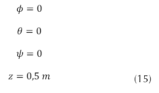 Para calcular los puntos de equilibrio del sistema, se ha de buscar los valores de las variables de estado que hacen nulo el vector de estados; para lograr esto se iguala el vector de estado a cero y resolvemos el sistema de ecuaciones. Una vez hecho esto, se obtiene que las configuraciones del punto de equilibrio están dadas por los valores presentes en la ecuación (15), los tres ángulos se encuentran en posición inicial a cero grados y la altura corresponde a 0.5 m, y las velocidades y aceleraciones angulares de entrada que dan lugar a esta configuración del sistema se presentan en la ecuación (16).