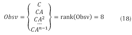 El análisis de observabilidad del sistema a controlar es dual a la controlabilidad, e investiga la posibilidad de estimar el estado del sistema a partir del conocimiento de la entrada y salida del quadrotor; considerando el sistema linealizado estacionario de la ecuación (10), el cual es observable para cualquier estado inicial x(0) (desconocido), existe un tiempo T1, pues conociendo la entrada U y la salida Y sobre el intervalo [0,T1] es suficiente para determinar en forma única el estado inicial x(0), en el cual aplicando la ecuación (18), y la aplicación del rango de la matriz de observabilidad ecuación (8), corresponde al mismo número de estados del sistema a observar, el sistema es totalmente observable.