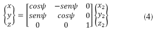 de (: en la ecuación (4) se presenta el tercer giro en el eje z, correspondiente al ángulo de guiñada (yaw) ψ, a partir del nuevo eje z