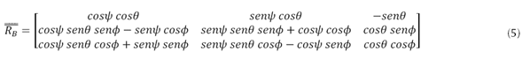 , y por su propiedad de ortonormalidad equivale a su transpuesta y viene dada por la matriz de rotación total del sistema como se aprecia en la ecuación (5).