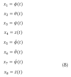 Considerando el vector de estados x(t) presente en la ecuación (7) con sus variables respectivas dadas por la ecuación (8), y el vector de entrada U, presentado en la ecuación (9), donde las entradas son mapeadas como se indica en la ecuación (10).