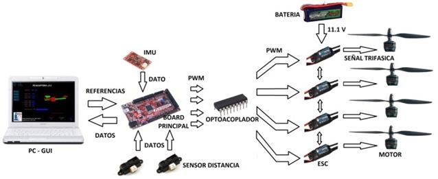 En los últimos años, se han realizado avances en el desarrollo de diferentes tipos de vehículos aéreos no tripulados, especialmente en aplicaciones civiles (búsqueda y rescate, vigilancia comercial, exploración de edificios, entre otras). Estos vehículos poseen sensores de medición de inercia IMU (del inglés Inertial Measurement Unit) y un sistema de procesamiento, los cuales permiten realizar cálculos complejos para aplicar estrategias de control, con el fin de estabilizar la posición y lograr una trayectoria de vuelo del vehículo, estas dos características componen un sistema de control de vuelo.