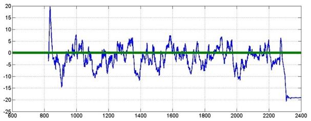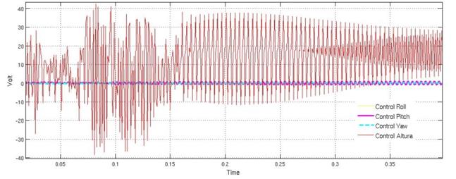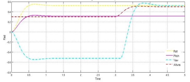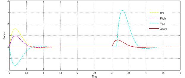 De igual forma, generando las gráficas para observar la reacción del sistema ante perturbaciones sobre el ángulo yaw (Figura 14 y Figura 15), se puede determinar que el seguimiento no es el deseado comparado con los obtenidos en los ángulos de pitch y roll, esto debido a que la fuerza ejercida sobre por perturbación, así como la generada por el controlador se realiza alrededor del eje z y no sobre este, como es el caso de los otros dos movimientos de rotación que aplican el torque sobre los ejes respectivos. Es por este motivo que se observa que el quadrotor reacciona de una manera más lenta cuando se requieren realizar movimientos sobre el eje z.