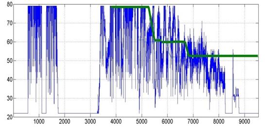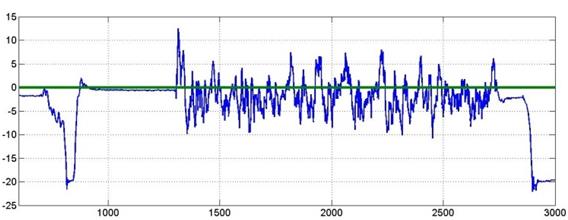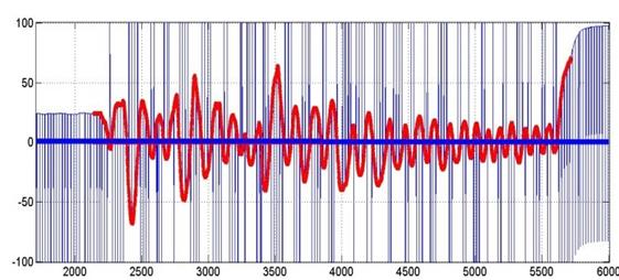La implementación de esta estrategia de control en el sistema puede llegar a generar un fenómeno conocido como chattering, se debe a que la frecuencia de conmutación en la práctica y en la simulación no se puede hacer infinita (Figura 8). Para reducir el fenómeno chattering, que puede generar problemas en los actuadores, se implementa un filtro Butterworth pasa bajas teniendo cuidado de no realizar un filtrado muy alto de la señal, el cual hace un compromiso al controlador ya que la alta conmutación en la ley de control es la que proporciona la robustez (Edwards, 1998).