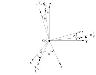 Figura 2 Rotación de los ángulos Tai-Bryan del sistema de coordenadas inercial al sistema de coordenadas fijado al helicóptero