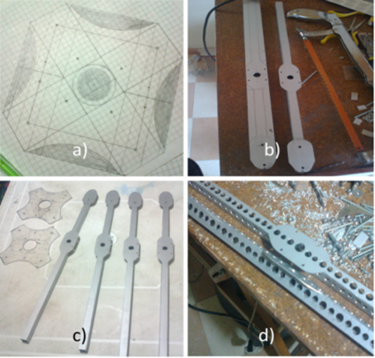 Se procede a la construcción del airframe (estructura), el cual fue enteramente diseñado y desarrollado por los autores del proyecto. En la Figura 3, se pueden observar las principales etapas de diseño y construcción del esqueleto del UAV. En la Figura 3a, se hace un primer periodo de diseño; inicialmente, la estructura tenía la capacidad de ser plegable para su fácil transporte por el usuario, pero cuando se instalaron los actuadores, ESC y demás componentes esta función se vio obstruida, además, previendo una posible fatiga de los cables y puntos de unión de los componentes dispuestos en este esqueleto y deteriorarse eléctricamente haciendo que el sistema no funcionara de manera adecuada. En la Figura 3b, se inicia a realizar los cortes en los materiales seleccionados, esto para fabricar las diferentes piezas del quadrotor, que tenían en ese momento el aspecto mostrado en la Figura 3c. Posteriormente, se procede a realizar agujeros a los brazos del quadrotor para reducir el peso total del mismo, el cual representaría un valor aproximado al 60% del total del sistema, lo anterior sin que el marco estructural pierda rigidez, Figura 3d.