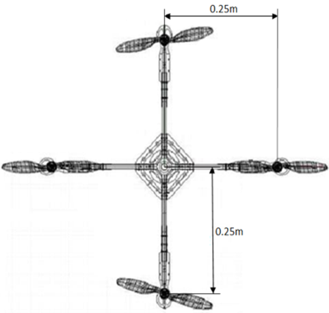 Posteriormente, se procede a establecer la medida más adecuada para la distancia entre el centro de gravedad del aparato y los respectivos motores, medida que se puede representar en la Figura 4, a la cual se le asigna el valor de 0.50 m, que no difiere sustancialmente de las medidas de estructuras comerciales las cuales varían entre 0.45 y 0.55 m.