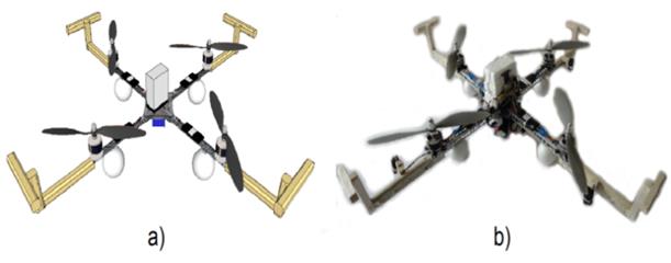 Se midieron los parámetros utilizados para realizar las simulaciones, en donde se obtuvo que la masa m = 1.075kg, y longitud del centro de masa al rotor, l = 0.21m el valor de gravedad que ya es conocido g = 9.81m/s. Los valores de las inercias del sistema fueron hallados utilizando un software con licencia GPL denominado Open Cascade, para desarrollo en 3D, en este software el modelo diseñado previamente en Google SketchUp es cargado y especificándole el tipo de materiales y el peso de cada una de las partes, genera las respectivas inercias en cada uno de los ejes, obteniendo así los valores correspondientes, en la Figura 5 se observa el prototipo simulado e implementado.