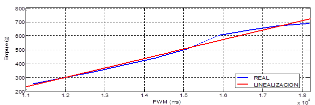 Para tener una plena dinámica de cada uno de los actuadores se procedió a medir y linealizar los empujes de cada motor gracias a una plataforma hecha en cursos anteriores de control de la Escuela de Ingeniería Electrónica de autoría de la ingeniera Sindy Amaya, la cual se adecúa perfectamente para la toma de datos, por su estructura muy similar a una balanza. Se tiene las siguientes linealizaciones de empuje versus PWM para cada actuador, en la Figura 9 se observa el comportamiento real y la linealización del primer motor, en este caso no se muestran los demás comportamientos, debido a que tienen un comportamiento de forma similar en los cuatro motores.