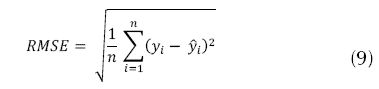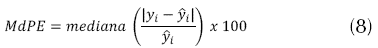 En orden de comparar la efectividad de las técnicas de interpolación, se utilizaron como métricas de error de predicción: el error medio absoluto (MAE) según la ecuación (7), la mediana del error predictivo (MdPE), mediante la ecuación (8) y la raíz del cuadrado medio del error (RMSE) por medio de la ecuación (9).