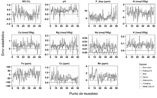 Excepto para MO, Fe y Pdisp, la SE fue alta para todas las técnicas de interpolación; por otro lado, excepto para Al, la mayoría de técnicas de interpolación presentaron tendencia a sobreestimación de valores en cada punto. Como se esperaba, las técnicas de interpolación local presentaron tendencia a predecir los valores más extremos para la mayoría de propiedades del suelo, en comparación con las demás técnicas de interpolación. En MO, entre los puntos cinco y veinte se presentó tendencia leve a la sobreestimación, mientras que en los puntos 30 al 40 a la subestimación.