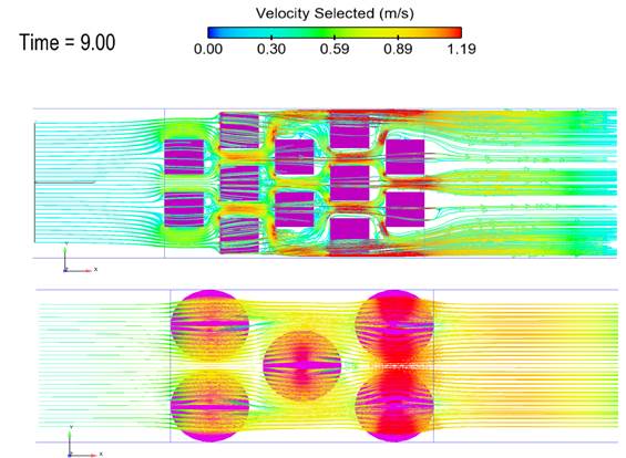 El campo de flujo alrededor del grupo de estructuras se ve afectado debido a la interacción de las líneas de flujo con las caras de las estructuras. En la figura 11 se observan las líneas de flujo alrededor del grupo de cubos (lado izquierdo) y conos (lado derecho). El color de las líneas de flujo corresponde a la variable de velocidad.