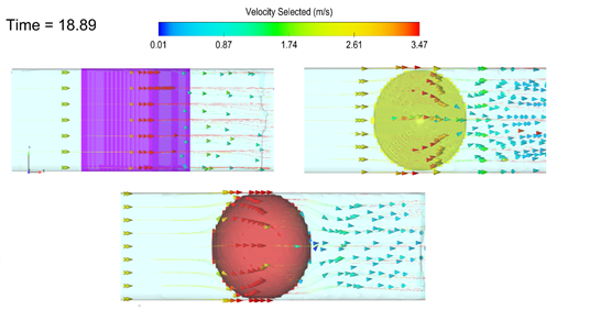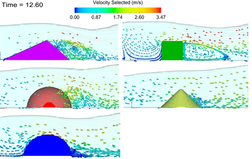 En dicha figura también se muestra el efecto que cada estructura tiene en el fluido; en el prisma triangular, el cubo y el cilindro, se crean vórtices al lado derecho, en la esfera se crea un pequeño vórtice en el lado de la estructura y en el cono no se crearon vórtices significativos. Estos vórtices representan los patrones de velocidad generados debido a la interacción del fluido con la estructura, y pueden indicar zonas en donde es posible que puedan presentarse en un futuro problemas de socavación. La diferencia entre los vórtices que se dan en cada estructura puede deberse a las características geométricas de las estructuras que producen cambios en el comportamiento del flujo alrededor de la estructura.