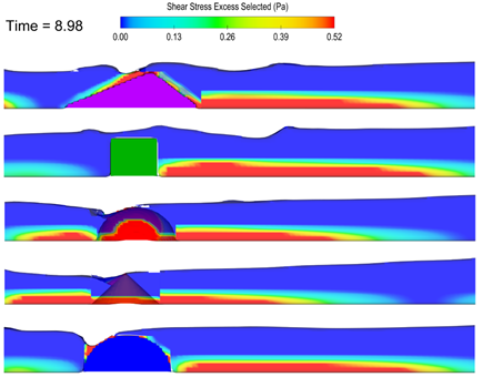 Relacionado con los vórtices está la velocidad del fluido alrededor de la estructura, la cual incrementa los esfuerzos cortantes en el lecho; de esta manera se ocasionarían problemas de erosión y socavación. En la figura 7 se ilustran los esfuerzos cortantes alrededor de la estructura después del paso de una ola, los cuales pueden asociarse con la velocidad. Las geometrías con un área proyectada de 1 (prisma triangular, cubo y cilindro) muestran los esfuerzos cortantes máximos al lado derecho de las estructuras, al nivel de la base, mientras que la esfera y el cono señalan los esfuerzos cortantes máximos a ambos lados de las estructuras.