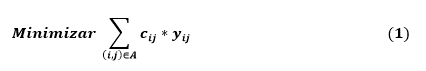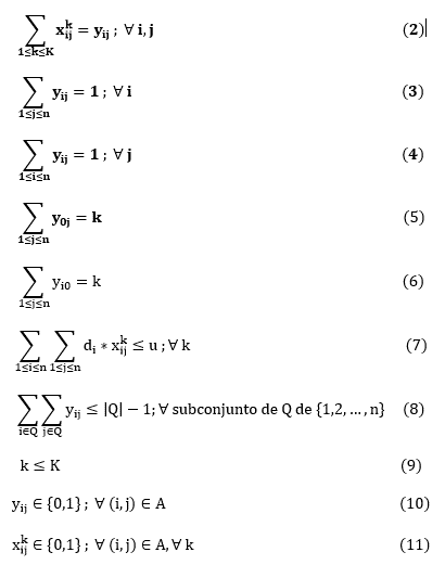 La ecuación (1), función objetivo, minimiza la suma de los costos de ir desde el punto de inicio hasta todos nodos. La ecuación (2) obliga a asignar un camión a la ruta (i,j), si esta va a ser transitada, y a no asignar si la ruta no va ser transitada. La restricción dada por la ecuación (2) usa la variable de decisión x, la cual para x=1, indica usar el vehículo k en el arco i, j, en caso contrario toma el valor de cero. En las ecuaciones (3) y (4) se describe la activación del arco (i, j) haciendo uso de la variable y. Al mismo tiempo se define un trayecto entre los nodos i, j, y se garantiza que un nodo sea visitado una vez por camión. Las ecuaciones (5) y (6) muestran para el parámetro k, la cantidad de vehículos utilizados en la solución que parten de un solo punto de inicio y deben regresar al mismo punto de inicio. En la ecuación (7) se define la capacidad del vehículo y se garantiza que no se sobrepase esta capacidad. La ecuación (8) se centra en evitar los ciclos para ello utiliza el conjunto de nodos. La ecuación (9) limita la cantidad de camiones que pueden ser utilizados, es decir la cantidad máxima y por último las ecuaciones (10) y (11) muestran que las variables x, y son binarias.