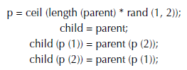 mutation_children.m: usa los padres para crear hijos mutados. Se seleccionan dos números aleatorios, los cuales hacen referencia a los alelos a modificar. Lo anterior se logró con las siguientes instrucciones: