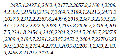 A continuación, se muestran las demandas de los puntos de recolección. Así, el primer valor 2435.1, se refiere a la cantidad de basura en kg generados en un barrio dado por un punto específico de recolección.