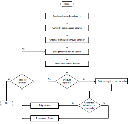 Esta metodología parte de una asignación preliminar que permite crear una ruta preliminar. Usa coordenadas angulares para determinar la posición de los clientes y simultáneamente ejecuta un barrido hasta encontrar el ángulo más cercano asociado con el vecino más cercano. Luego, traza una línea desde el origen-deposito hasta el cliente. Se guardan la información de la ruta si cumple con las restricciones de capacidad del vehículo, en el caso que existan dos clientes con los mismos ángulos de orientación se cataloga según el radio más cercano. En la figura 2 se muestra la heurística de barrido.