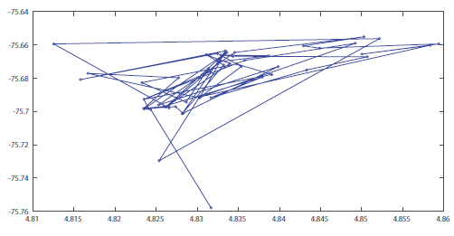 La figura 5 muestra la ubicación en latitud y longitud de los puntos de recolección de basura. La tabla 3 muestra los tiempos y costos reales de recorrido de estos vehículos de los 144 puntos.