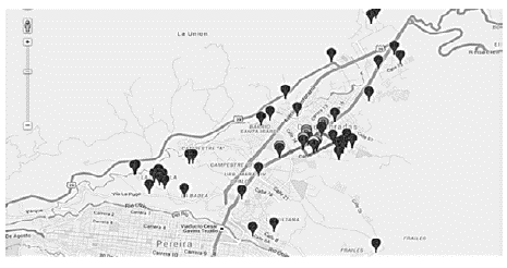 En este caso se obtuvo una distancia promedio de 16,15 km con un tiempo real promedio de 6,12 h (tabla 2), para un tiempo de 1 hora con 37 minutos de lo que se puede obtener un valor de velocidad media para rutas sin congestión vehicular de 2,64 m/h. Ahora se escogerá una ruta con los puntos de recolección (tabla 1).