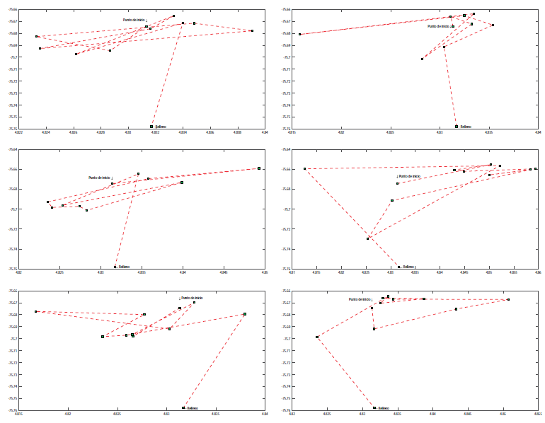 El punto de partida encontrado por el análisis de conglomerado de medias y que proporciona la ubicación de punto de partida tuvo las siguientes coordenadas: latitud 4.833.974 y longitud -75.681499. Este punto corresponde a la ubicación de Centro Administrativo Municipal, Dosquebradas, Risaralda. A partir de este punto de partida de los camiones mediante la heurística de barrido se generaron una serie de potenciales rutas. Utilizando el código 1. Heurística de barrido, la técnica heurística de barrido generó un conjunto de rutas (vectores) de menor distancia que corresponden a los diferentes recorridos que deben realizar los camiones siete (7) para visitar todos los 144 puntos de recolección de basura (tabla 4).