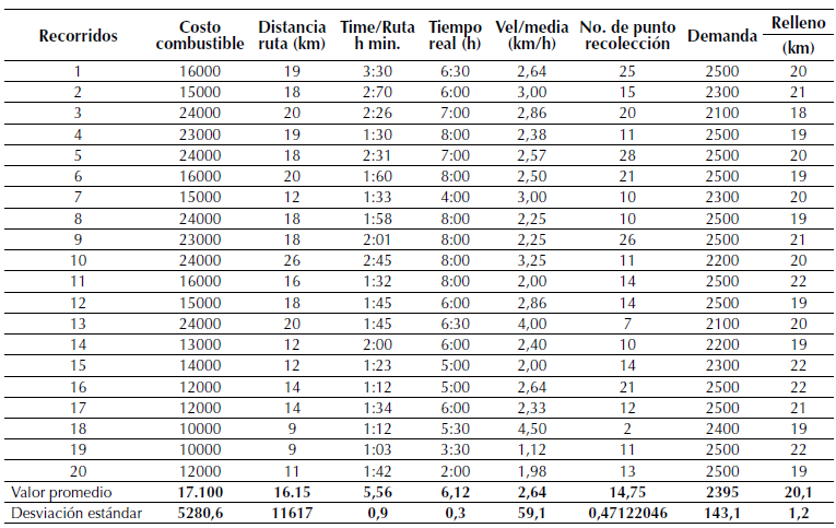 De acuerdo con la tabla 2 se identifica la velocidad a la cual se mueven los vehículos, se muestra la velocidad promedio, que es de 2,7 km/h, con un costo total promedio de aproximadamente 17.100 COP/km * 20 km = 342.000, por ruta hasta el relleno sanitario.