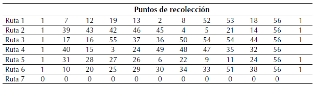 Los resultados de correr el algoritmo Chu-Beasley con todos los datos anteriores se muestran en la figura 10. El primer valor 1 hasta el siguiente valor 1, después del valor 56, representa el recorrido de un vehículo recolector, a través de los puntos 7, 12, 19, 13, 2, 8, 52, 53, 56, considerando los valores de basura a recolectar en cada barrio. Un nuevo valor 1 significa el inicio de una nueva ruta.