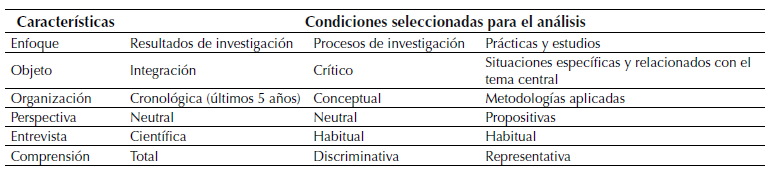 Tabla 1 Características y condiciones del alcance del análisis de literatura científica