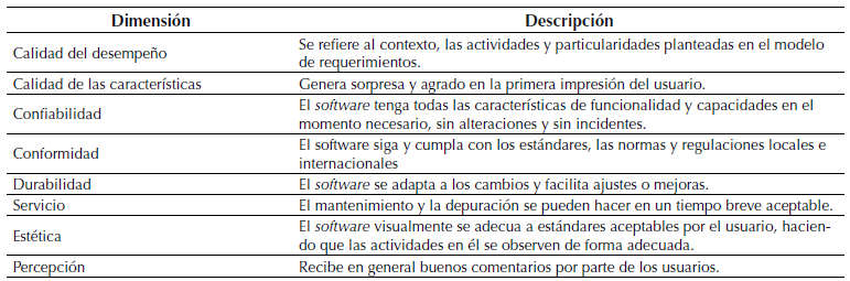 Estas tres definiciones brindan pautas para asegurar que la calidad de software se debe relacionar con el producto y con el proceso, donde factores como los requerimientos funcionales y no funcionales, además de los deseados por el usuario, deben ser componentes medibles dentro de las dimensiones de calidad (tabla 2).