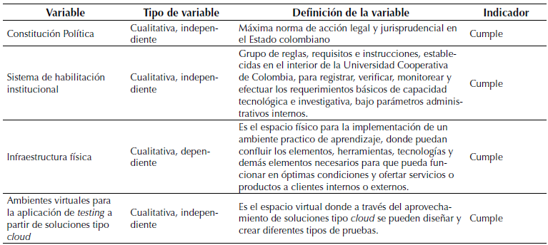 La Universidad Cooperativa de Colombia ha estructurado en sus campus los ambientes prácticos de aprendizaje (APA), unos espacios físicos o virtuales diseñados para que de manera experimental y controlada el estudiante confronte, aplique o genere conocimiento en un escenario similar o modelado a su ejercicio profesional. Entre estos ambientes se encuentran los laboratorios, simuladores, software y modelos a escala (UCC, 2014). En base a lo establecido en las normas internas de la Universidad cooperativa de Colombia, se plantea la tabla 3 de variables acorde a la normativa, con ella se refuerza la pertinencia de implementar un laboratorio de testing de software en el campus Popayán.