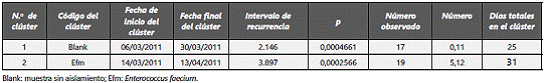 Se realizaron análisis de manera prospectiva diariamente para el primer semestre de 2011 para todos los microorganismos, con la intención de identificar el brote de E. faecium previamente caracterizado. Se obtuvo la primera alerta el día 13 de abril de 2011 con 103 simulaciones (tabla 3).