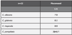 C. albicans fue la especie más frecuentemente aislada, lo cual corresponde a lo reportado en otros estudios internacionales incluyendo latinoamericanos15,18,19. Todos los aislamientos de C. albicans, fueron sensibles al FCZ20.
