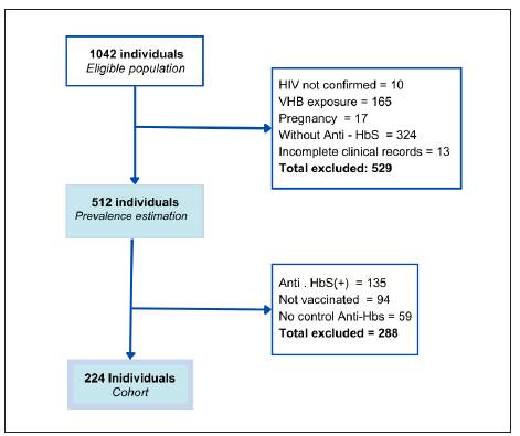 We conducted a retrospective cohort study in two HIV outpatient clinics in Cali, Colombia. Adult patients registered for the first time between March 2017 and March 2020, with HIV confirmed according to international guidelines 15, and with available reports of HBV surface antigen (HBsAg), anti-HBs, and antibodies against HBV core antigen (Anti-HBc) on admission were screened. Those patients with reported levels of anti-HBs ≤ 10 IU/ml on admission were included if they received at least one dose of HBV vaccine and were followed up to assess anti-HBs post-vaccination. Pregnant women, individuals with active or previous HBV infection according to serological markers 8) were excluded. The outcome was lack of seroconversion defined as anti-HBs ≤10 IU/ml post vaccination 8. The sample size was estimated in 195 patients based on an expected incidence of lack of seroconversion of 40%, 36% exposed to CD4+ T-cell count < 200 cells 12,16, RR of 1.6, 95% confidence level, and 80% statistical power. All eligible patients were included. The study was approved by both clinics and the Ethical Review Board of Universidad del Valle (E037-022).