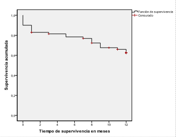 De los 70 pacientes operados el 82,9 % sobrevivieron al mes de operados, el 76,9 % a los siete meses de operados, el 65,9 % a los 11 meses, y la posibilidad de estar vivo al primer año fue del 62,5 %. Por otro lado, el promedio de supervivencia a un año de estos pacientes fue de 9,3 meses IC95 % [8,2; 10,3] (Figura 1).