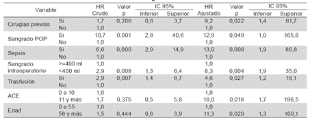 En el análisis multivariado los factores que se encontraron asociados a la supervivencia ajustada a un año de los pacientes operados con cáncer ampular o del páncreas fueron las cirugías previas (p=0,022), el sangrado posoperatorio (p=0,049), la sepsis (p=0,008), el sangrado intraoperatorio mayor a 400 mililitros (p=0,004), la trasfusión de glóbulos rojos (p=0,027), el antígeno carcinoembrionario (p=0,018) y la edad (p=0,029). Los pacientes con cirugías previas de abdomen murieron 0,7 veces más rápido que los pacientes sin cirugías previas, al ajustar por otras variables los pacientes con cirugías previas murieron 8,2 veces más rápido; es decir que el verdadero riesgo se estaba subestimando. La presencia de sangrado posoperatorio incrementó la velocidad de muerte en 10,7 veces con respecto a la no presencia de sangrado; al ajustar por otras variables la velocidad de muerte en los pacientes con sangrado posoperatorio fue de 12,9 veces. Los pacientes con sepsis murieron 5,6 veces más rápido con respecto a los pacientes sin sepsis y el HR ajustado en los pacientes con sepsis fue de 13,0 veces con respecto a los pacientes sin sepsis; es decir que se estaba subestimando el verdadero riesgo de morir en un 97,0 %. La razón de peligro de muerte en los pacientes que sangraron en la cirugía más de 400 mililitros fue de 2,9 veces con respecto a los pacientes que sangraron 400 mililitros o menos; pero haber sangrado en la cirugía más de 400 mililitros incrementó la velocidad de muerte con un HR ajustado de 8,3 veces. La muerte fue 1,9 veces más rápido en los pacientes con trasfusión de glóbulos rojos y al ajustar, estos pacientes murieron 3,6 veces más rápido. La edad y el CA 19-9 fueron factores que se encontraron asociados con la supervivencia a un año en el análisis multivariado pero no en el análisis bivariado, por lo que la razón de peligro de muerte en pacientes de 56 años y más fue de 1,5 veces con respecto a los pacientes menores de 56 años; mientras que la razón de peligro de muerte ajustada fue 11,3 veces. Los pacientes con un ACE de 11 µg/L y más murieron 0,7 veces más rápido con respecto a los pacientes con un ACE menor de 11 µg/L, al ajustar por las demás variables los pacientes con un ACE de 11 µg/L y más murieron 17,0 veces más rápido (Tabla 2).