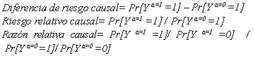 Para explicar de manera sencilla la medición de efectos causales bajo este modelo usaré varios de los elementos y consideraciones de Hernan y Robins, principales exponentes y defensores del modelo de inferencia causal con-trafactual en la actualidad 14. Intuitivamente un factor puede definirse como causa de un efecto en un individuo si se obtuvieran desenlaces diferentes para el mismo individuo al mismo tiempo bajo condiciones diferentes del factor (ejm presencia o ausencia de una causa). En consecuencia, el efecto causal de una exposición en un individuo es definido como un contraste de los desenlaces contrafactuales. En otras palabras, existe un efecto causal en un individuo cuando el desenlace que observaríamos bajo una intervención o exposición es diferente del desenlace que observaríamos en el individuo en ausencia de la intervención o exposición. Usando un lenguaje estadístico lo que estamos diciendo es 13: