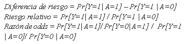 A partir de estas medidas se podrá decir que el tratamiento A esta asociado con el desenlace Y si Pr[Y=1\ A=1] ≠ Pr[Y=1 | A=0]. De lo contrario diremos que el tratamiento A y el resultado Y son independientes 6.