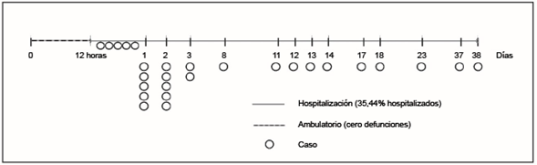 La Tabla 1 describe las características generales de los casos confirmados: predominó el sexo masculino (53,5%, 174/325). Solo se atendió a 15,7% (51/325) indígenas, 74,5% (242/325) tuvieron atención ambulatoria y el porcentaje restante fue hospitalizado. La Secretaría de Salud brindó 96,6% (314/325) de las atenciones; el resto, instituciones de seguridad social. El 92,9% (26/28) de las defunciones ocurrieron en los servicios públicos gubernamentales, y el resto en instituciones de seguridad social. El 96,4% de los fallecimientos (27/28) fue en población no indígena. Hubo más defunciones (67,9%, 19/28) en los hombres; solo falleció una mujer indígena (3,6%, 1/28). Hubo defunciones en el hospital antes de que la persona cumpliera un día de interna-miento (17,9%, 5/28) (Figura 2).