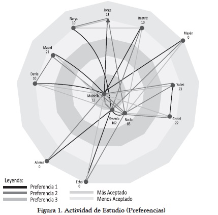 Precisamente, la aplicación del sociograma permite identificar importantes aspectos del desarrollo de la grupalidad. Así, con respecto a las mutualidades, se constata que existen un total de ocho, que corresponden a la actividad de estudio. Las principales emergen entre los estudiantes que son más aceptados por los compañeros en dicha actividad, y los alumnos que son aislados no poseen ninguna. Estas mutualidades evidencian alianzas entre determinados miembros del grupo, cuyas interacciones resultan notables y se muestran en las Figuras 1 y 2, pero la estrella sociométrica en esta actividad es la líder informal del grupo, que obtuvo un total de cinco, lo cual corrobora su protagonismo y relevancia dentro de este.