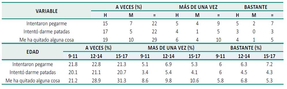 El resultado de la Tabla 1 describe la existencia de la intimidación física en un total del 38 % de los niños participantes, siendo bastante para un 7 % de estudiantes, y describe la forma ascendente del hecho a edades entre los 9 a 11 años (32.9 %), así como su estabilización entre 12-14 años (34 %) y 15-17 años (33.8 %).