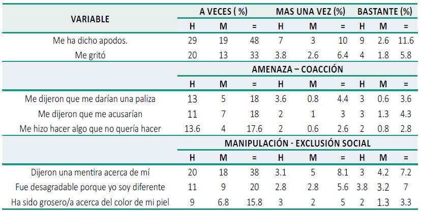 La Tabla 2, por su parte, describe la existencia de la intimidación psicológica para el 68.6 % de estudiantes, con una frecuencia de bastante para el 11.6 %. Además, para la edad de 9 a 11 años, sucede en el 55.6 % entre los 12 a 14 años al 73 % y a los 14 y 17 años al 69.7 %. Más concretamente, han amenazado con darle una paliza al 26 %, siendo bastante para el 3.6 %; y han coaccionado al 22.8 % siendo bastante para el 2.8 %. Asimismo, para el 53.3 % dicen una mentira acerca de la víctima y es bastante para el 7.2 %, entre edades de 9 a 11 años, cuando le sucede al 45.8 %, a los 12 a 14 años, que ocurre al 57.4 % y entre los 15 a 17 años, al 56.3 %, resultando, además, desagradables por considerar al estudiante diferente al 32.6 %.