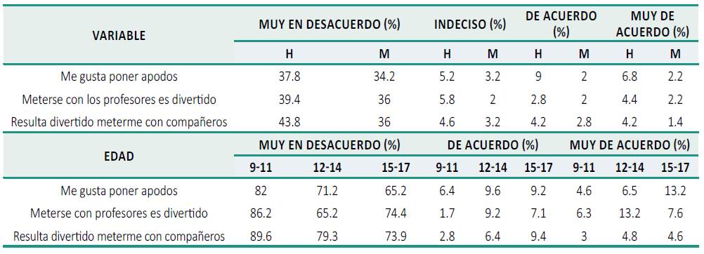 En la Tabla 3 se observa que dar apodos es divertido para el 20 % de estudiantes, y en la edad de 9 a 11 años, esta idea es frecuente en el 11 %. Pero para los 15 y 17 años aumenta al 22.4 % de estudiantes.