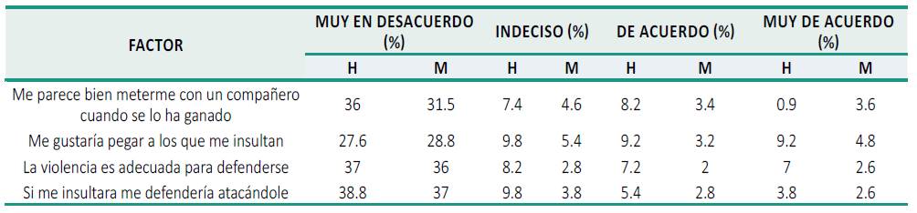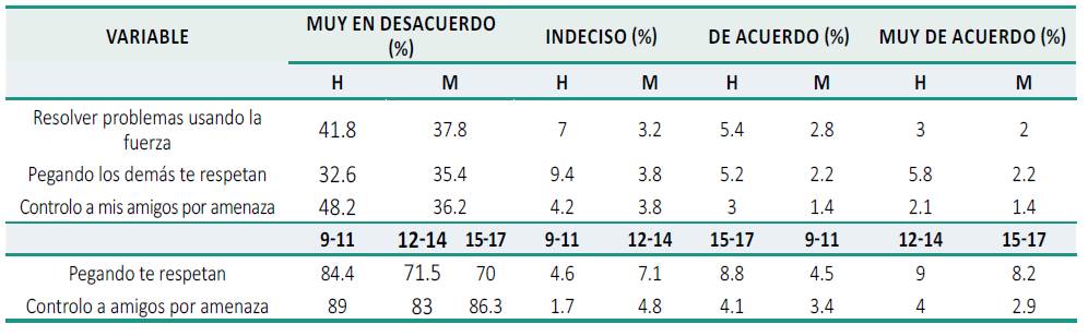 En la tabla 5 es evidente que el 16.1 % de los estudiantes consideran que está bien agredir a un compañero cuando se lo ha ganado, y esto es más frecuente entre los 15 a los 17 años en un 27.9 %. En este último grupo, usar la violencia para defenderse es aprobado por el 18.8 %, pero en edades entre 9 a 11 años el porcentaje es del 9.6, de los 12 a 14 años es del 19 %, y entre los 15 a 17 años del 19.3%.