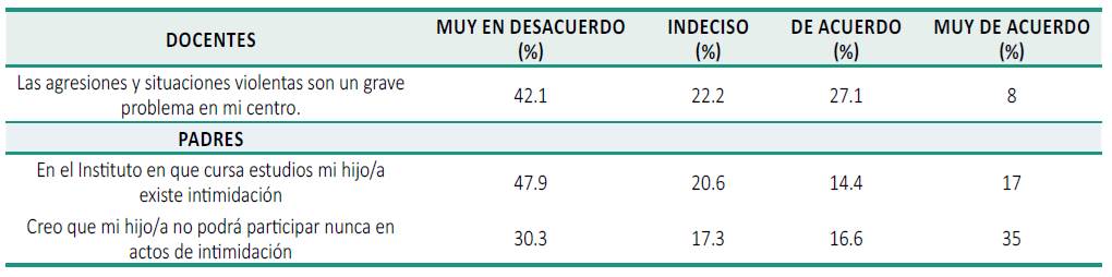 La percepción e identificación del fenómeno entre docentes y padres es del 31 % y 35 %, respectivamente, lo que podría relacionarse con la identificación de la intimidación de tipo física; en tanto que la intimidación psicológica, que es mayor, podría no estar siendo referenciada por docentes y padres. Ello implica la necesidad de capacitar a la comunidad educativa en el reconocimiento del fenómeno (Buitrago, Pulido & Güichá-Duitama, 2017).