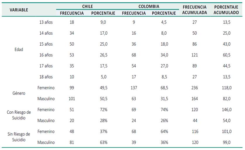 La muestra se compone así: 99 participantes de género femenino y 101 participantes de género masculino en Chile, y 137 participantes de género femenino más 63 participantes de género masculino en Colombia. Para el análisis de los datos se conformaron dos grupos: el grupo sin riesgo de suicidio o control (chilenos y colombianos) y el grupo con riesgo de suicido (chilenos y colombianos).