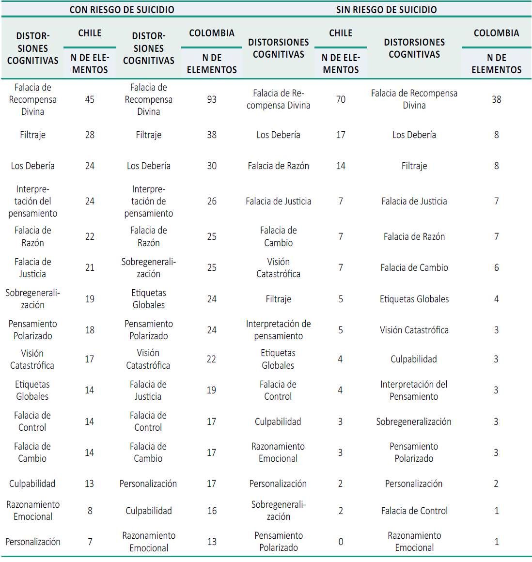 Respecto a dicha relación entre las variables de la investigación, se observa que todas las distorsiones cognitivas presentan una relación estadísticamente significativa con el riesgo de suicidio en la muestra de adolescentes chilenos y colombianos, salvo la Falacia de Recompensa Divina en los participantes chilenos, de manera que las distorsiones cognitivas dan cuenta de cierta predisposición para procesar información (Gutiérrez, Ceniceros & Méndez, 2012), provocando una disminución de las respuestas adaptativas.