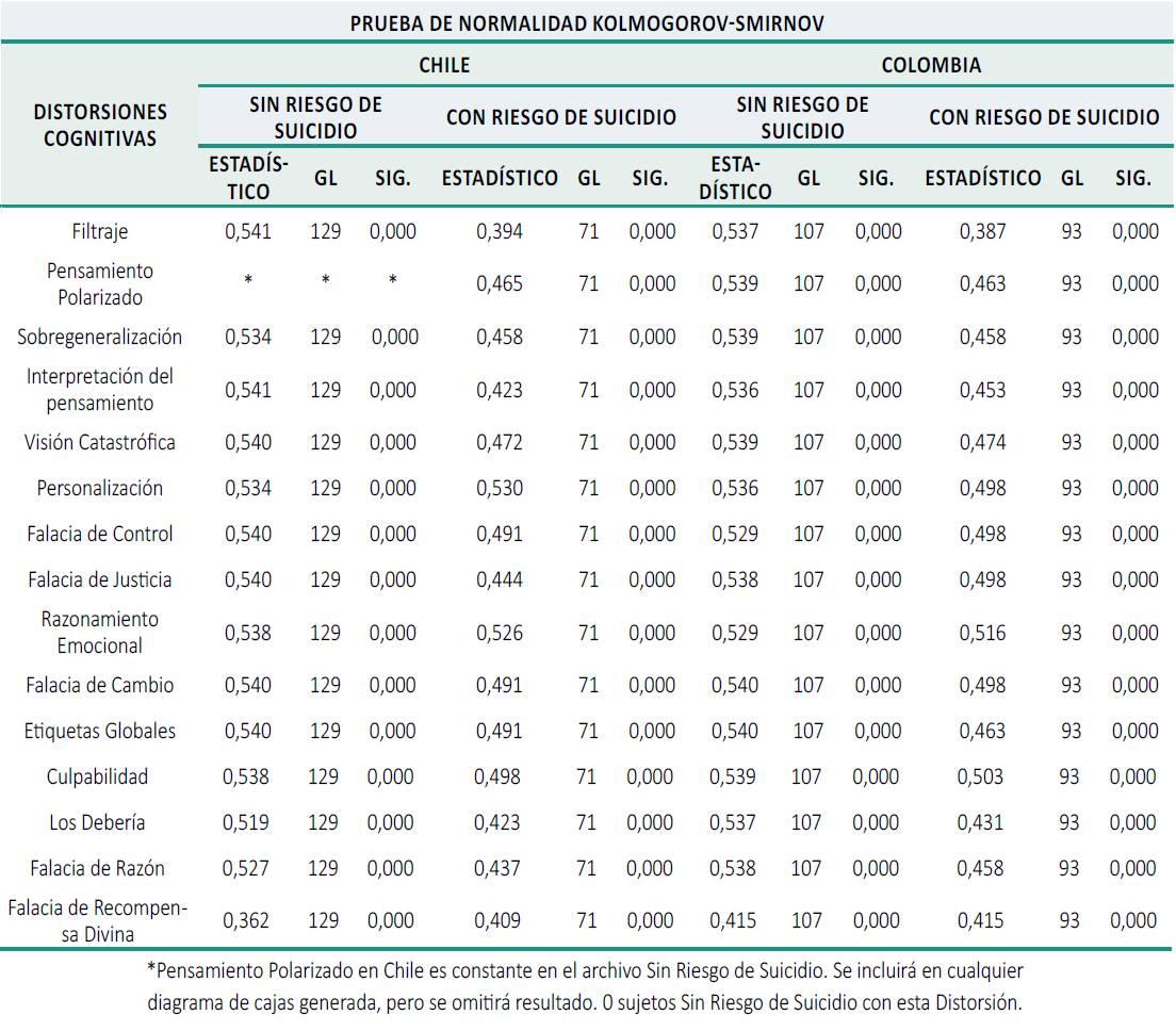 En la Tabla 5 se evidencia que los datos en la muestra completa no presentan distribución normal (α < 0,05). Además, de las 15 distorsiones cognitivas evaluadas, la correspondiente a Pensamiento Polarizado no se identificó en ninguno de los participantes chilenos del grupo sin riesgo de suicidio (Ver Tablas 4 y 5).